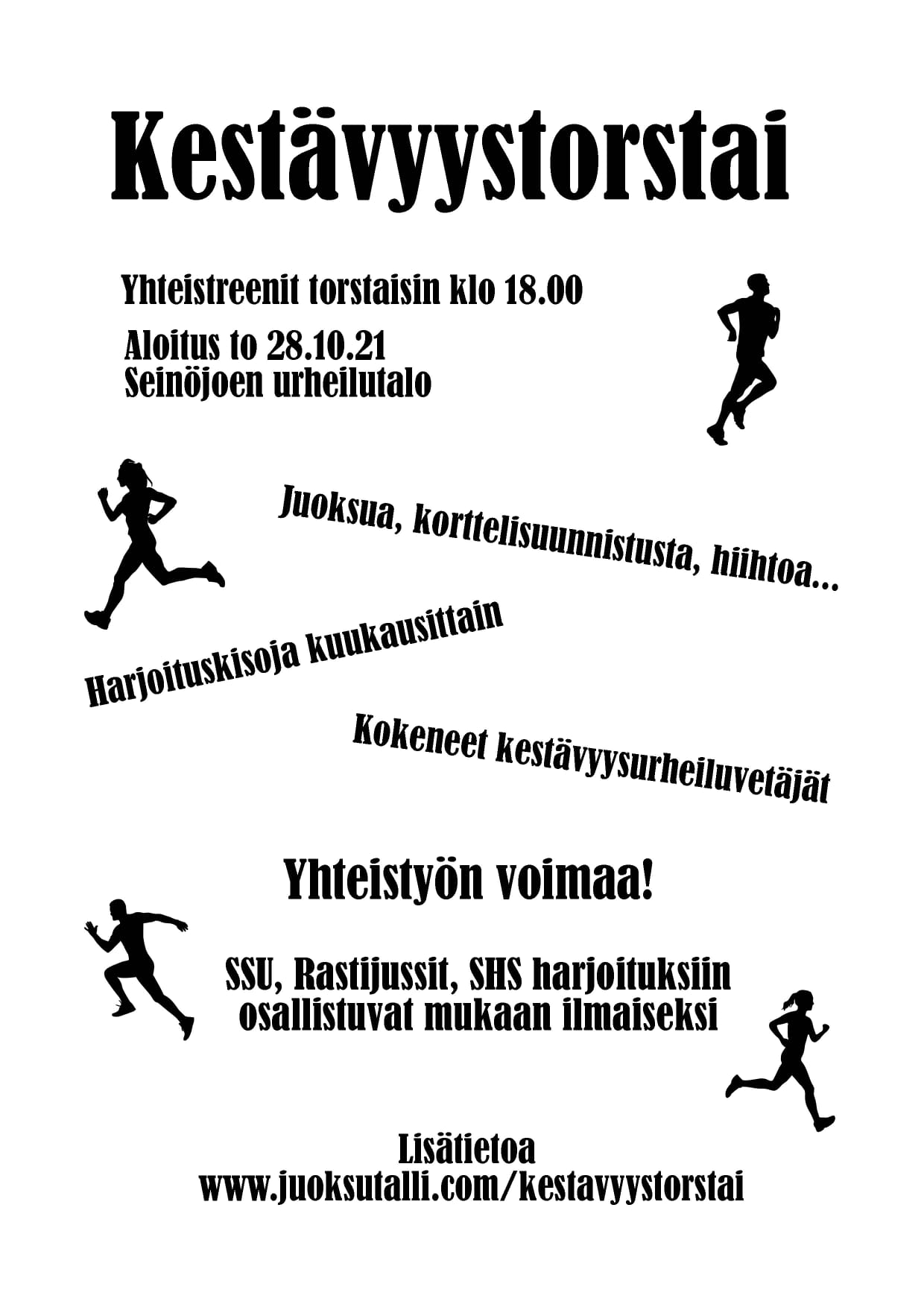 SSU, Rastijussit ja SHS järjestävät viikosta 43 alkaen torstaisin yhteisharjoitukset, joihin SSU Junioreilla ja valmennusryhmäläisillä on mahdollisuus osallistua ilman lisämaksuja. Ensimmäinen kokoontuminen to 28.10. klo 18 Seinäjoen Urheilutalolla. Tervetuloa!