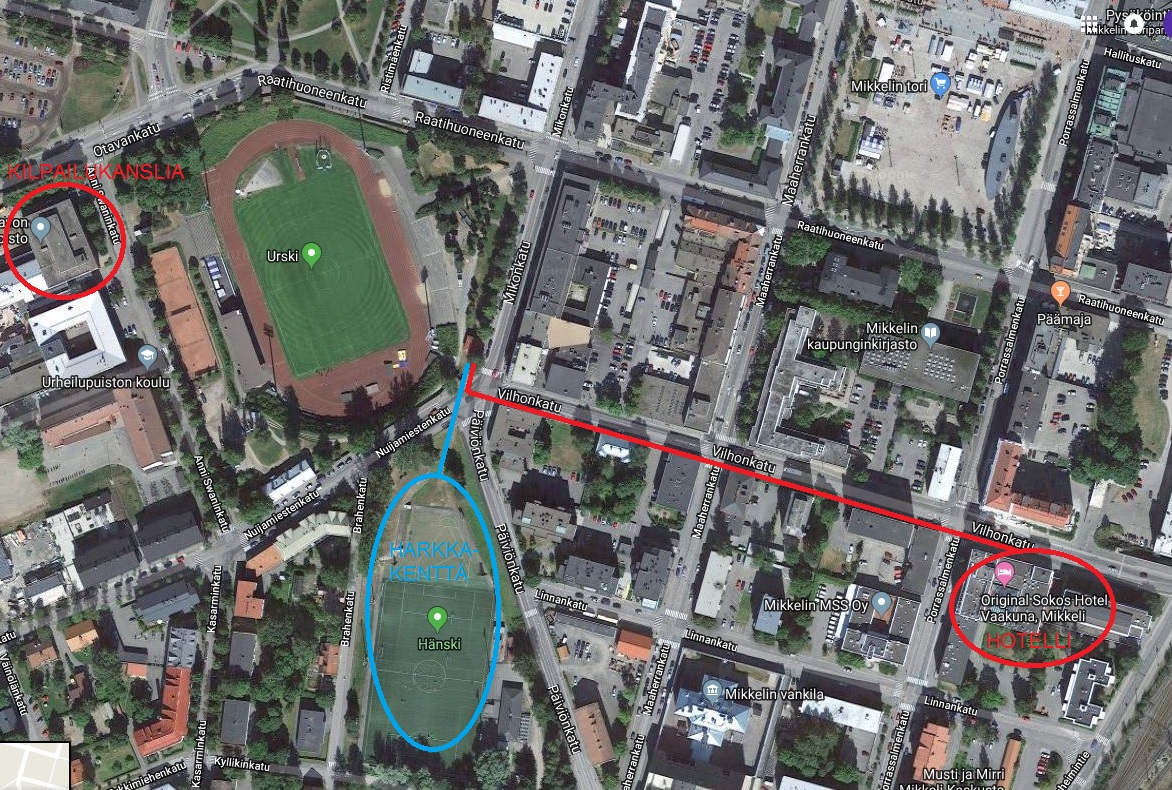 Matkaan lähdetään perjantaina klo 15.00 Prisman parkkipaikalta kaupungin puoleiselta reunalta. Matkan aikana pysähdytään syömään Vaajakosken ABC:lle. Perillä olemme n. 19.30. Majoitumme Sokos Hotel Vaakunaan. Huonejaon jälkeen käymme vielä urheilukentällä tutustumassa ja tekemässä lyhyen verryttelyn. Kuva, jossa mm. kentän ja hotellin sijainti löytyy tässä.